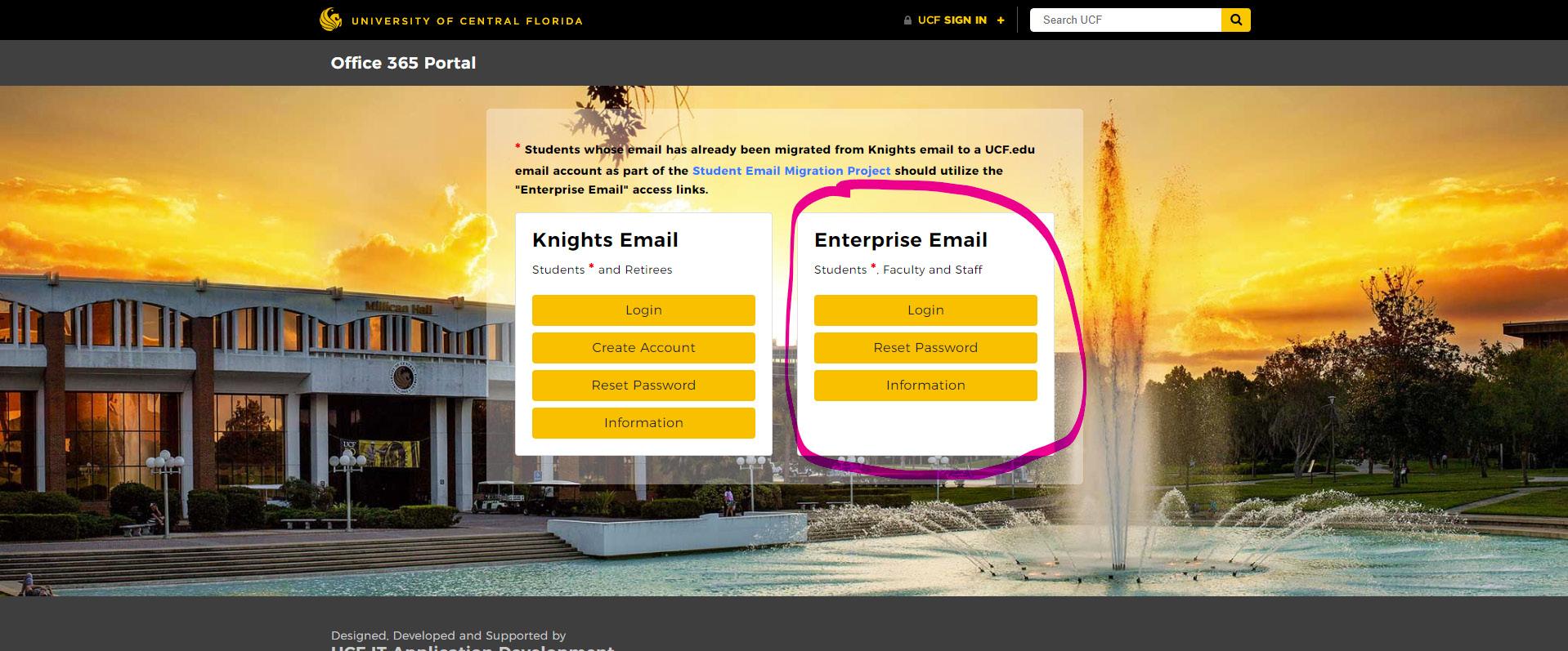 For assistance with resetting a password or logging into to UCF email contact the service desk at 407-823-5117 or itsupport@ucf.edu or chat online at ucf. service-now.com/ucfit https://office365.ucf.edu/