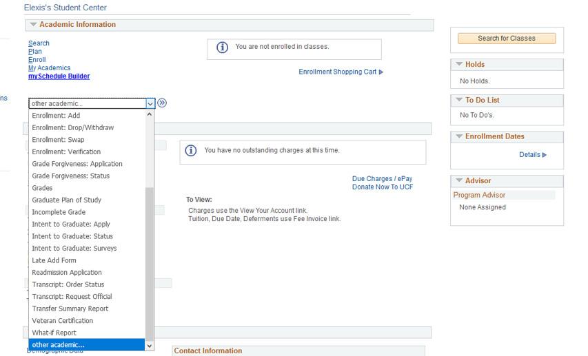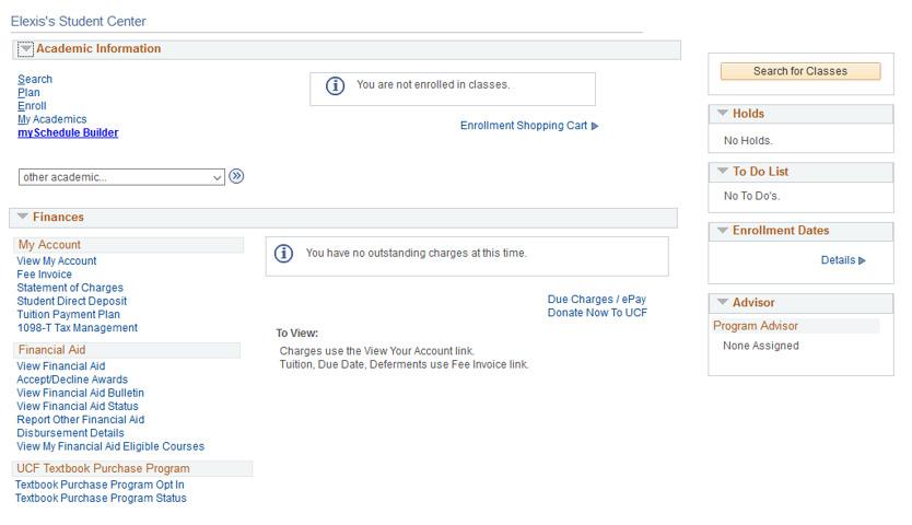 The Student Center is the main page to myUCF. It is found in the menu on the left hand side under Student Self Service.