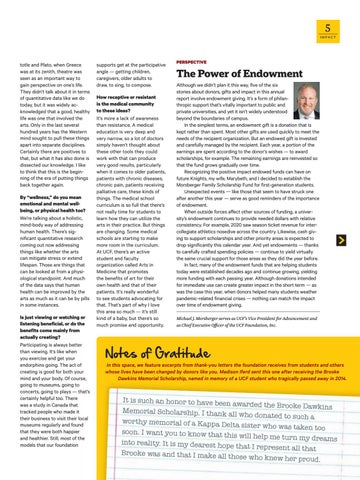 The Power of Endowment Although we didn’t plan it this way, five of the six stories about donors, gifts and impact in this annual report involve endowment giving. It’s a form of philanthropic support that’s vitally important to public and private universities, and yet it isn’t widely understood beyond the boundaries of campus. In the simplest terms, an endowment gift is a donation that is kept rather than spent. Most other gifts are used quickly to meet the needs of the recipient organization. But an endowed gift is invested and carefully managed by the recipient. Each year, a portion of the earnings are spent according to the donor’s wishes — to award scholarships, for example. The remaining earnings are reinvested so that the fund grows gradually over time. Recognizing the positive impact endowed funds can have on future Knights, my wife, Marybeth, and I decided to establish the Morsberger Family Scholarship Fund for first-generation students. Unexpected events — like those that seem to have struck one after another this year — serve as good reminders of the importance of endowment. When outside forces affect other sources of funding, a university’s endowment continues to provide needed dollars with relative consistency. For example, 2020 saw season ticket revenue for intercollegiate athletics nosedive across the country. Likewise, cash giving to support scholarships and other priority areas is expected to drop significantly this calendar year. And yet endowments — thanks to carefully crafted spending policies — continue to yield virtually the same crucial support for those areas as they did the year before. In fact, many of the endowment funds that are helping students today were established decades ago and continue growing, yielding more funding with each passing year. Although donations intended for immediate use can create greater impact in the short term — as was the case this year, when donors helped many students weather pandemic-related financial crises — nothing can match the impact over time of endowment giving.