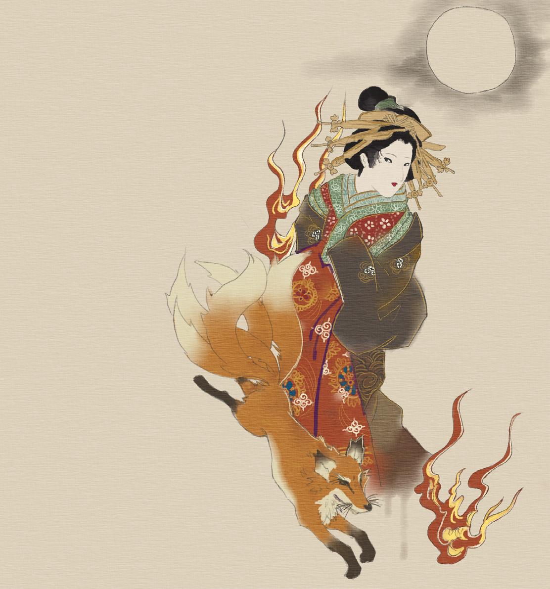 Fox spirits are known as tricksters who enjoy playing pranks on humans. One of the kitsune's favorite transformations is into a woman, often done to mock, frighten, or even seduce men. Fox-mothers, fox weddings, fox women, and fox possession stories abound in Japanese folklore.
