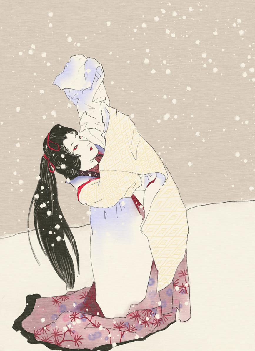 From Kabuki play Sagi Musume. Though the heron maiden is not directly linked to Yuki Onna, the setting of freezing winter, the dance of torments and pity in the final performance amidst the falling snow demonstrated the idea of mono-no-aware - the transcience of things. Snow, as a substance that quickly melts in warmer air, is an embodiment of impermanence. This sadness in the passing of things is also expressed in Sagi Musume. doors and indulge in fantasies that their deepest desires had finally arrived. These ephemeral visions of happiness, as transient as snow, allowed them to momentarily dwell in a world where their longings were fulfilled. Lafcadio Hearn's story of Yuki Onna, depicted her as a spirit that returned as a woman with everlasting beauty in order to pursue humanly love.