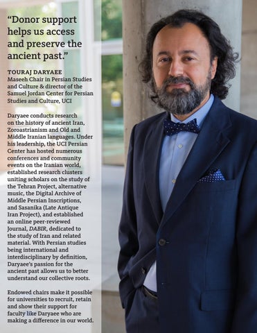“Donor support helps us access and preserve the ancient past.” TOURAJ DARYAEE Maseeh Chair in Persian Studies and Culture & director of the Samuel Jordan Center for Persian Studies and Culture, UCI Daryaee conducts research on the history of ancient Iran, Zoroastrianism and Old and Middle Iranian languages. Under his leadership, the UCI Persian Center has hosted numerous conferences and community events on the Iranian world, established research clusters uniting scholars on the study of the Tehran Project, alternative music, the Digital Archive of Middle Persian Inscriptions, and Sasanika (Late Antique Iran Project), and established an online peer-reviewed Journal, DABIR, dedicated to the study of Iran and related material. With Persian studies being international and interdisciplinary by definition, Daryaee’s passion for the ancient past allows us to better understand our collective roots. Endowed chairs make it possible for universities to recruit, retain and show their support for faculty like Daryaee who are making a difference in our world.