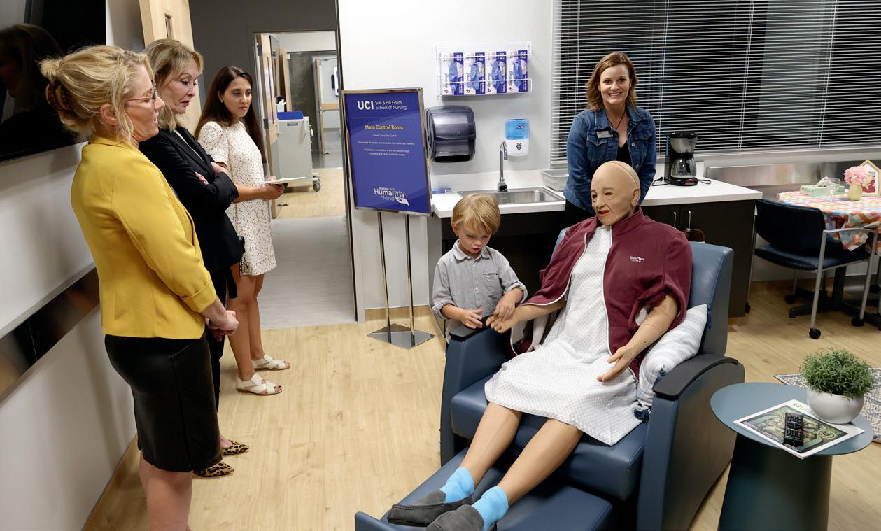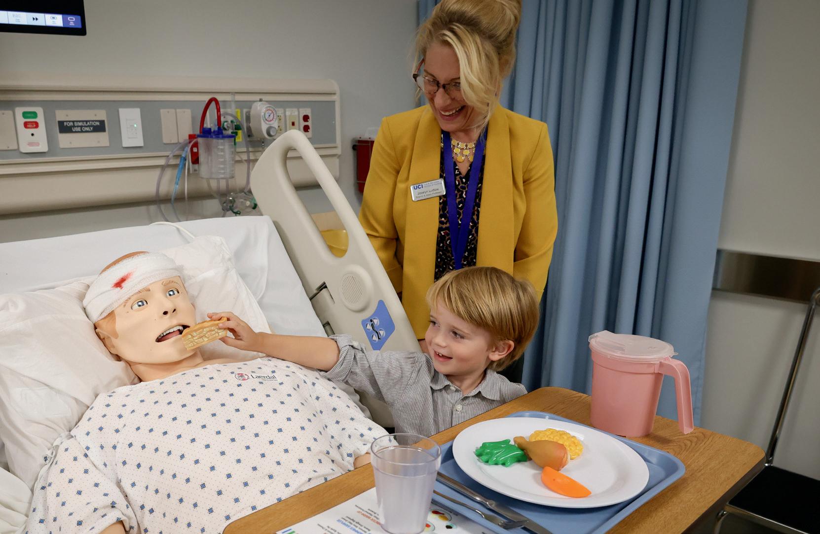 In the simulation center, Sue Gross’s grandson takes care of a manikin patient’s nutritional needs while Director of Simulation Jocelyn Ludlow supervises.