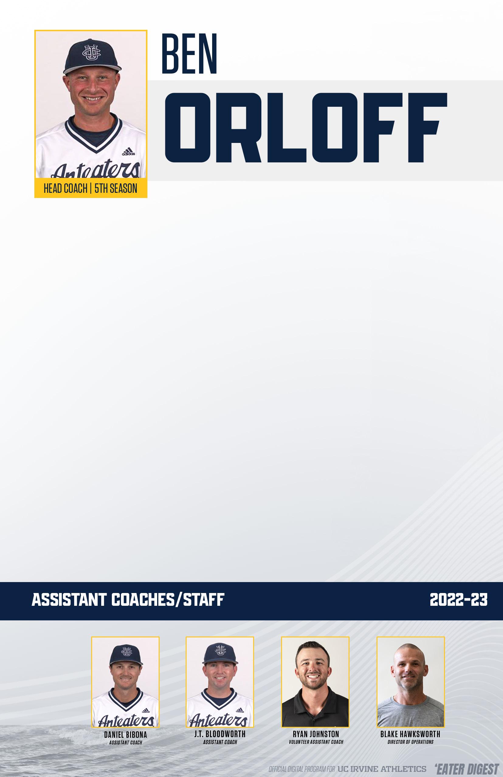Ben Orloff enters his fifth year atop the Anteater baseball program as head coach and 10th season with the program for the 2022-23 school year. Orloff assumed the reins of UC Irvine Baseball in July of 2018 as the ninth head coach in program history. Orloff initially joined the coaching staff in 2014 as an assistant rising to associate head coach in the five years since. In his first year in 2019, he took the team to a second-place finish in the Big West going 37-17 overall with 21 home wins.