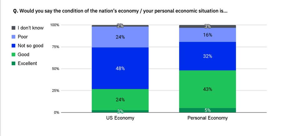 Orange County residents split evenly in describing their own economics: 48 percent say their personal economic situation is good or excellent, whereas 48% call it not so good or poor. These results are in marked contrast to residents’ assessment of the nation’s economy. Nearly three-quarters (72%) of respondents say the nation’s economy is not so good or poor, while just 27% call it good or excellent.