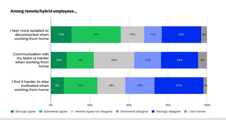 Workers praise work-from-home as providing greater flexibility and additional leisure time while improving their productivity. Pluralities say they can maintain their motivation and remain in communication with co-workers. Almost half (45%) report feeling more isolated from remote work, compared to 36% who disagree.