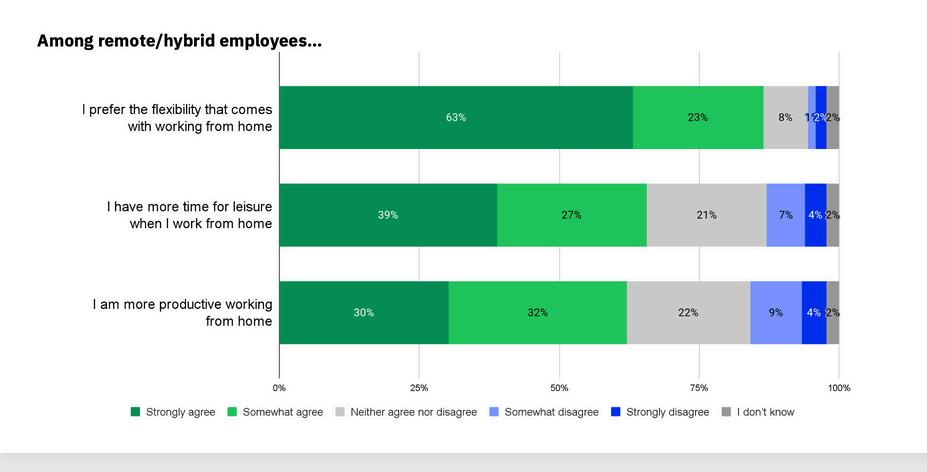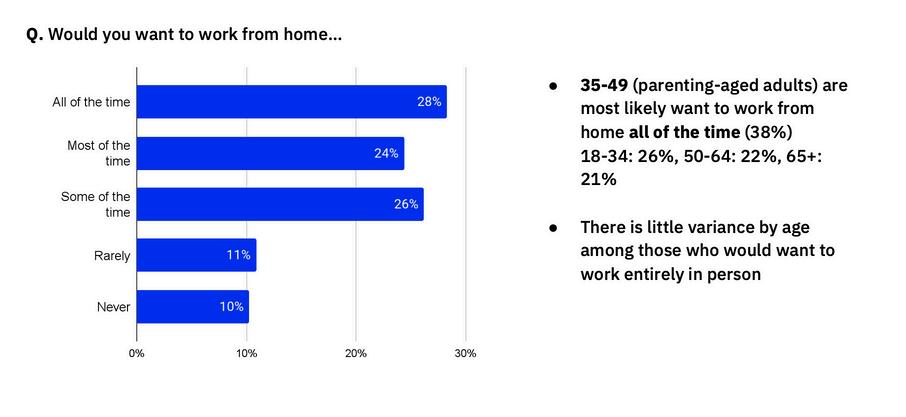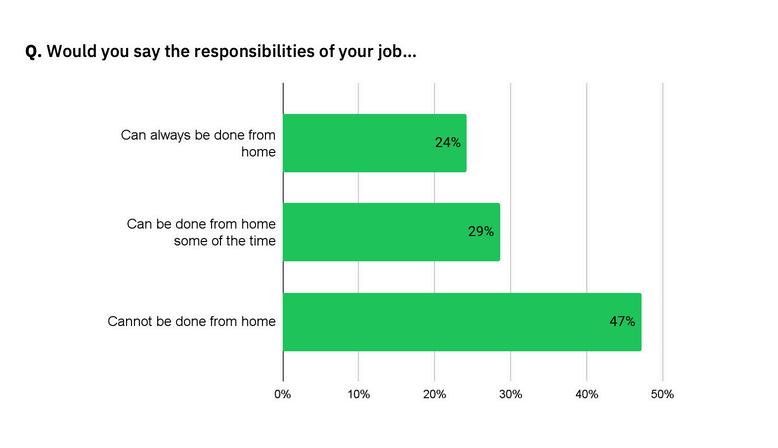 Given the choice, a majority (52%) of workers desire a hybrid work schedule most or all the time, and another quarter would like to do so some of the time However, nearly half (47%) of workers say their job responsibilities cannot be done from home