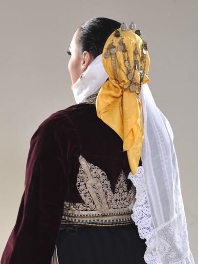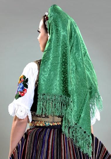 Околина Брчког, Босанска Посавина УРАДИЛА: АНА ПЕТКОВИЋ Кад стасају за удају девојке почињу носити јаглук. То је узани дугуљасти комад платна ткан од памучне или свилене нити, са китом од вунице или свиле најчешће црвене боје. не код ушију. На његовом другом крају налазила се улагана шара. Јаглук је могао бити украшен и шљокицама или чипком по рубу, а намештао се тако да велика кићанка дође напред на чело и добије изглед праве капе гледајући спреда. На темену се причврсти иглом башлијом. Испод ките на јаглуку, тј. по челу долазила је подниза од малих дуката.