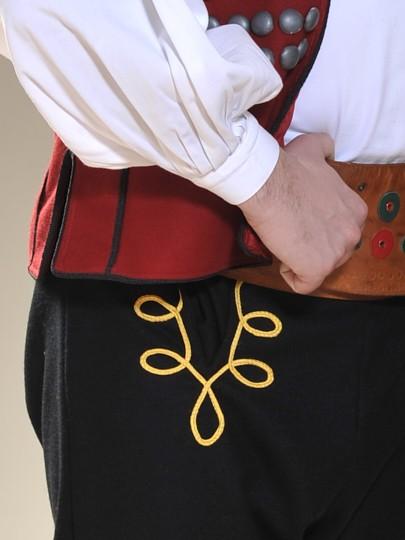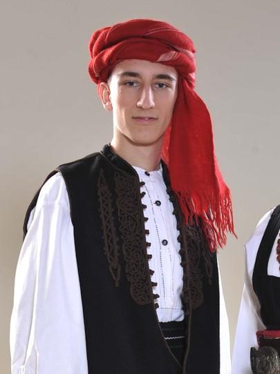 ЛИКА Мушка народна ношња састоји се од беле ткане кошуље, тканих црних панталона (бравенаца) и прслука црне боје са украсним црвеним везовима по рубовима и предњем делу прслука. Саставни део ношње су и вунене беле личке чарапе украшене фронцлама и браон или жути лички опанци . Саставни део ношње је и украшени појас (пасњача), мајица (xемпер), лички кожун и личке цокље (вунене кратке чарапе подашивене са гумом). Мушкарци су обавезно носили на глави личку капу црвено-црну, са изражајним кићенкама (ресама) које су се спуштале низ рамена или пребацивале преко рамена на груди. ЛИЧКА ТОРБА