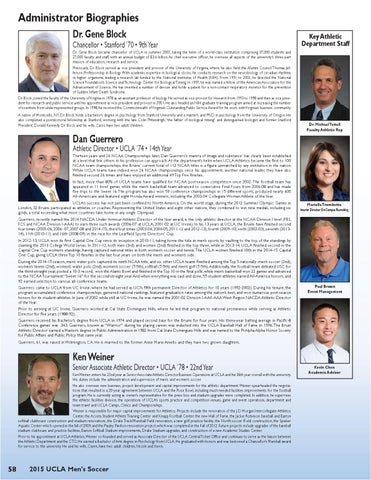 Athletic Director • UCLA ’74 • 14th Year Thirteen years and 26 NCAA Championships later, Dan Guerrero’s mantra of ‘image and substance’ has clearly been established at a level that few others in his profession can approach. At the department’s helm when UCLA Athletics became the first to 100 NCAA team championships, the Bruins’ current total of 112 NCAA titles is a figure unmatched by any institution in the nation. While UCLA teams have indeed won 26 NCAA championships since his appointment, another national leader, they have also finished second 26 times and have enjoyed an additional 49 Top Five finishes. In fact, more than 80% of UCLA teams have qualified for NCAA post-season competition since 2002. The football team has appeared in 11 bowl games while the men’s basketball team advanced to consecutive Final Fours from 2006-08 and has made five trips to the Sweet 16. The program has also won 59 conference championships in 15 different sports, produced nearly 600 All-Americans and featured eight Honda Award winners, including the 2003-04 Collegiate Woman Athlete of the Year. UCLA’s success has not just been confined to North America. On the world stage, during the 2012 Summer Olympic Games in London, 32 Bruins participated as athletes or coaches. Representing the United States and eight other nations, they combined to win nine medals, including six golds, a total exceeding what most countries take home in any single Olympiad.