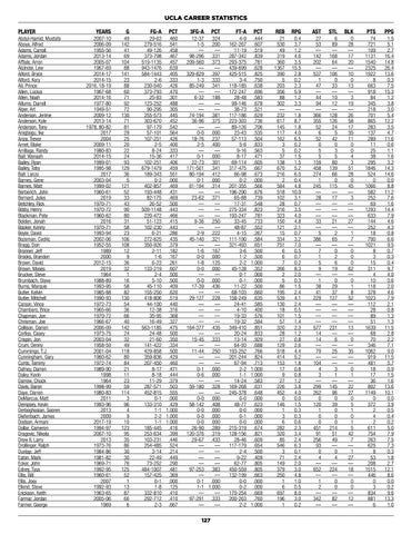 UCLA CAREER STATISTICS PLAYER Abdul-Hamid, Mustafa Aboya, Alfred Adams, Carroll Adams, Jordan Afflalo, Arron Alcindor, Lew Alford, Bryce Alford, Kory Ali, Prince Allen, Lucius Allen, Noah Allums, Darrell Alper, Art Anderson, Jerime Anderson, Kyle Anderson, Tony Anigbogu, Ike Ariza, Trevor Arnet, Blake Arrillaga, Randy Bail, Wanaah Bailey, Ryan Bailey, Toby Ball, Lonzo Barnes, Gene Barnes, Matt Berberich, John Bernard, Jules Betchley, Rick Bibby, Henry Blackman, Pete Bolden, Jonah Booker, Kenny Boyle, David Bozeman, Cedric Bragg, Don Bronner, Jeff Brooks, Brandon Brown, David Brown, Moses Brucker, Steve Brumbach, Steve Burns, Marquis Butler, Kelvin Butler, Mitchell Carson, Vince Chambers, Brice Chapman, Jon Chrisman, Joe Collison, Darren Corliss, Casey Crispin, Jon Crum, Denny Cummings, T.J. Cunningham, Gary Curtis, Tommy Dafney, Darren Daley, Kevin Darrow, Chuck Davis, Baron Daye, Darren DeMarcus, Matt Dempsey, Kevin Derboghosian, Sooren Diefenbach, James Dodson, Armani Dollar, Cameron Dragovic, Nikola Drew II, Larry Drollinger, Ralph Dunlap, Jeff Eaton, Mark Ecker, John Edney, Tyus Ellis, Bill Ellis, Joey Elkind, Steve Erickson, Keith Farmar, Jordan Farmer, George