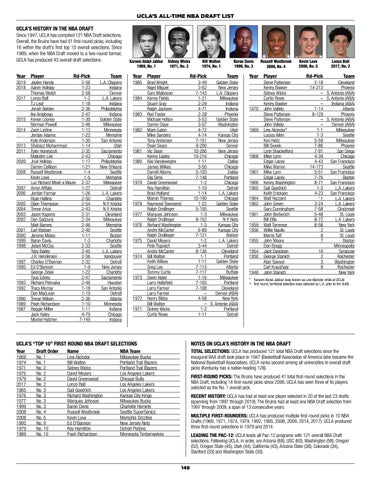 UCLA’S ALL-TIME NBA DRAFT LIST UCLA’S HISTORY IN THE NBA DRAFT Since 1947, UCLA has compiled 121 NBA Draft selections. Overall, the Bruins have had 41 first-round picks, including 16 within the draft’s first top 10 overall selections. Since 1989, when the NBA Draft moved to a two-round format, UCLA has produced 43 overall draft selections.
