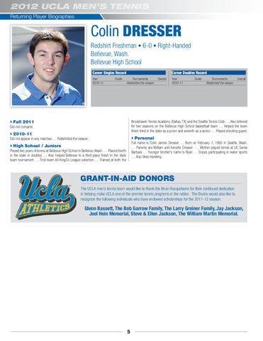 GRANT-IN-AID DONORS GR The UUCLA men’s tennis team would like to thank the Bruin Racqueteers for their continued dedication in help helping make UCLA one of the premier tennis programs in the nation. The Bruins would also like to recognize the following individuals who have endowed scholarships for the 2011-12 season: recogn