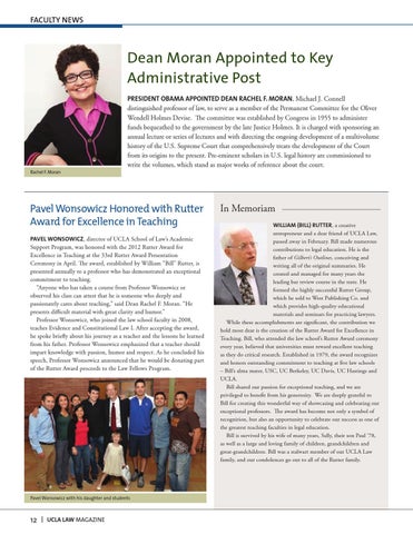Pavel Wonsowicz Honored with Rutter Award for Excellence in Teaching Pavel WonsoWicz, director of UCLA School of Law’s Academic Support Program, was honored with the 2012 Rutter Award for Excellence in Teaching at the 33rd Rutter Award Presentation Ceremony in April. The award, established by William “Bill” Rutter, is presented annually to a professor who has demonstrated an exceptional commitment to teaching. “Anyone who has taken a course from Professor Wonsowicz or observed his class can attest that he is someone who deeply and passionately cares about teaching,” said Dean Rachel F. Moran. “He presents difficult material with great clarity and humor.” Professor Wonsowicz, who joined the law school faculty in 2008, teaches Evidence and Constitutional Law I. After accepting the award, he spoke briefly about his journey as a teacher and the lessons he learned from his father. Professor Wonsowicz emphasized that a teacher should impart knowledge with passion, humor and respect. As he concluded his speech, Professor Wonsowicz announced that he would be donating part of the Rutter Award proceeds to the Law Fellows Program.
