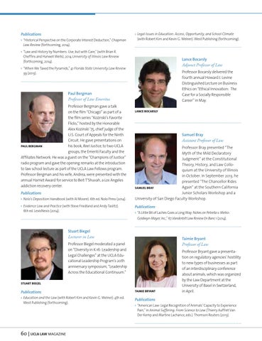 Professor of Law Emeritus Professor Bergman gave a talk on the film “Chicago” as part of a the film series “Kozinski’s Favorite Flicks,” hosted by the Honorable Alex Kozinski ’75, chief judge of the U.S. Court of Appeals for the Ninth Circuit. He gave presentations on his book, Reel Justice, to two UCLA PAUL BERGMAN groups, the Emeriti Faculty and the Affiliates Network. He was a guest on the “Champions of Justice” radio program and gave the opening remarks at the introduction to law school lecture as part of the UCLA Law Fellows program. Professor Bergman and his wife, Andrea, were presented with the annual Harriet Award for service to Beit T’Shuvah, a Los Angeles addiction recovery center. Publications s