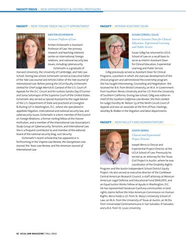 Susan Gillig has returned to UCLA School of Law on a recall basis to serve as Interim Assistant Dean for Clinical Education, Experiential Learning and Public Service. Gillig previously served as Assistant Dean for Clinical Programs, a position in which she oversaw development of the clinical program and administered the externship program. She has taught Interviewing, Counseling and Negotiation. She received her B.A. from Bristol University, an M.A. in Government from Southern Illinois University and her J.D. from the University of Southern California. During law school, Gillig was editor-inchief of the Southern California Law Review. She then clerked for Judge Dorothy W. Nelson ’53 of the Ninth Circuit Court of Appeals and was an associate at the firm of Paul, Hastings, Janofsky & Walker in the litigation and labor departments.