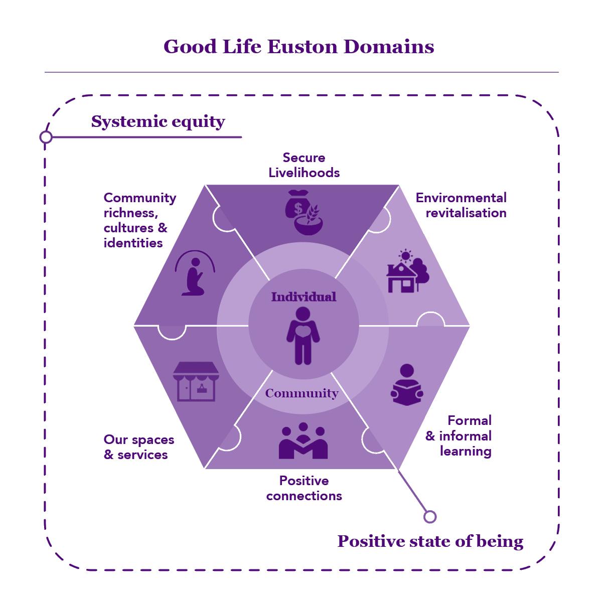 The ‘Good Life Euston Model’ is an important tool in the process of developing a shared evidence base to inform regeneration planning; it represents the lived experiences and priorities of local residents and in this sense provides an alternative starting point for understanding ‘success’, ‘social value’ and ‘regeneration impact’ measures. For more information click here.