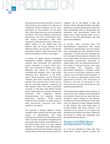 traditions left by the British in East and Southern Africa, although the latter were often weakened in the post colonial period. There has been considerable effort to decentralize and strengthen local governments across the region, and in many countries there is now a mixture of the local administration and local government traditions. In Europe, many countries show rich decentralization experiences with strong institutional underpinnings, but the systems vary considerably and face significant policy challenges. In North America, Canadian and U.S. local governments play an important role in the public sector, but they are creatures of intermediate governments (provinces or states) rather than the national government. This leads to internal diversity since each province/state has separate local government legislation, a situation which also occurs in some other countries in other regions, such as Argentina and Australia. In the U.S., there is a particularly complex local government structure with thousands of counties, and tens of thousands of subcounty general-purpose governments and special-purpose districts. These governance traditions across regions, of course, have been subject to evolving political and economic forces over the years that have resulted in many changes to the systems, including to the fiscal architecture. At the same time, the influence of these traditions persists in both obvious and more subtle ways. In moving forward with future reforms, it is important to be aware of the nature and strength of this influence and what it implies for the pursuit of viable and sustainable local government finance reforms.