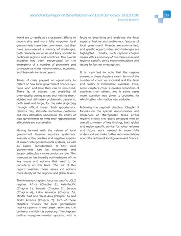 focus on describing and analyzing the fiscal aspects. Positive and problematic features of local government finance are summarized, and specific opportunities and challenges are highlighted. Finally, each regional chapter closes with a summary of the main issues and regional specific policy recommendations and issues for further investigation. It is important to note that the regions covered in these chapters vary in terms of the number of countries included and the level and quality of information available. Thus, some chapters cover a greater proportion of countries than others, and in some cases more attention was given to countries for which better information was available. Following the regional chapters, Chapter 8 focuses on the special circumstances and challenges of Metropolitan Areas across regions. Finally, the report concludes with an overall summary of key findings, both global and region specific advice for policy reforms and future work needed to more fully understand and make further recommendations about the reform of local government finance.