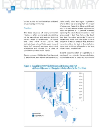 Structure The basic structure of intergovernmental relations is often summarized with statistics on the expenditure and revenue shares of various levels of government. The figure and table which follow provide the estimated sub-national (total, upper tier, and lower tier) shares of aggregate government expenditure and revenue for a range of countries in the Asia Pacific Region. Two points are worth highlighting. First, the extent of expenditure and revenue decentralization