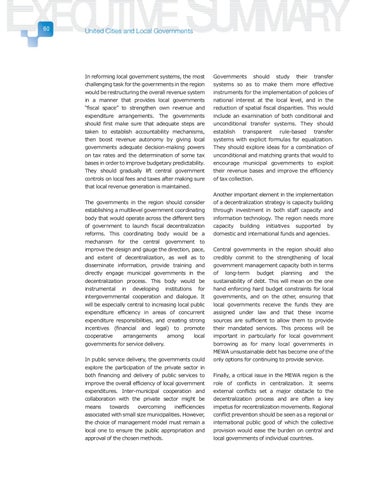 Governments should study their transfer systems so as to make them more effective instruments for the implementation of policies of national interest at the local level, and in the reduction of spatial fiscal disparities. This would include an examination of both conditional and unconditional transfer systems. They should establish transparent rule-based transfer systems with explicit formulas for equalization. They should explore ideas for a combination of unconditional and matching grants that would to encourage municipal governments to exploit their revenue bases and improve the efficiency of tax collection. Another important element in the implementation of a decentralization strategy is capacity building through investment in both staff capacity and information technology. The region needs more capacity building initiatives supported by domestic and international funds and agencies. Central governments in the region should also credibly commit to the strengthening of local government management capacity both in terms of long-term budget planning and the sustainability of debt. This will mean on the one hand enforcing hard budget constraints for local governments, and on the other, ensuring that local governments receive the funds they are assigned under law and that these income sources are sufficient to allow them to provide their mandated services. This process will be important in particularly for local government borrowing as for many local governments in MEWA unsustainable debt has become one of the only options for continuing to provide service. Finally, a critical issue in the MEWA region is the role of conflicts in centralization. It seems external conflicts set a major obstacle to the decentralization process and are often a key impetus for recentralization movements. Regional conflict prevention should be seen as a regional or international public good of which the collective provision would ease the burden on central and local governments of individual countries.