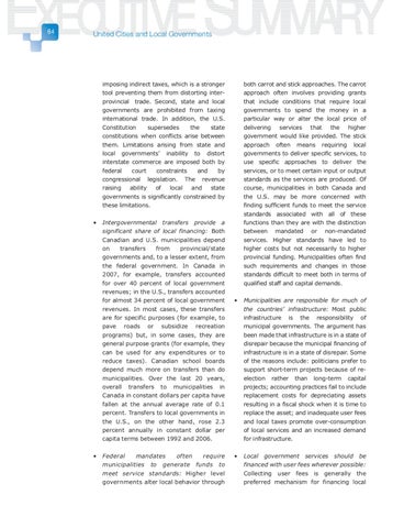 Intergovernmental transfers provide a significant share of local financing: Both Canadian and U.S. municipalities depend on transfers from provincial/state governments and, to a lesser extent, from the federal government. In Canada in 2007, for example, transfers accounted for over 40 percent of local government revenues; in the U.S., transfers accounted for almost 34 percent of local government revenues. In most cases, these transfers are for specific purposes (for example, to pave roads or subsidize recreation programs) but, in some cases, they are general purpose grants (for example, they can be used for any expenditures or to reduce taxes). Canadian school boards depend much more on transfers than do municipalities. Over the last 20 years, overall transfers to municipalities in Canada in constant dollars per capita have fallen at the annual average rate of 0.1 percent. Transfers to local governments in the U.S., on the other hand, rose 2.3 percent annually in constant dollar per capita terms between 1992 and 2006. Federal mandates often require municipalities to generate funds to meet service standards: Higher level governments alter local behavior through