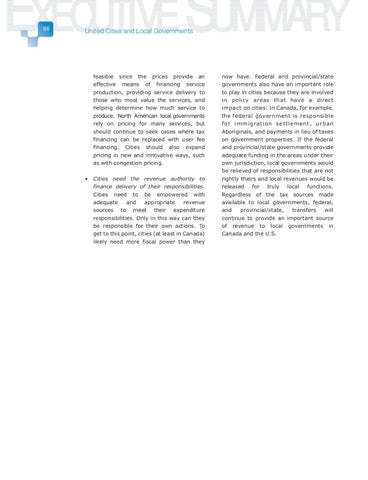 now have. Federal and provincial/state governments also have an important role to play in cities because they are involved in policy areas that have a direct impact on cities. In Canada, for example, the federal government is responsible f o r i m m i g ra t i o n s e t t l e m e n t , u r b a n Aboriginals, and payments in lieu of taxes on government properties. If the federal and provincial/state governments provide adequate funding in the areas under their own jurisdiction, local governments would be relieved of responsibilities that are not rightly theirs and local revenues would be released for truly local functions. Regardless of the tax sources made available to local governments, federal, and provincial/state, transfers will continue to provide an important source of revenue to local governments in Canada and the U.S.