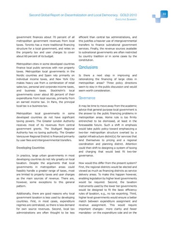 Conclusions Is there a next step in improving and rationalizing the financing of large cities in metropolitan areas? Three policy directions seem to stay in the public discussion and would seem worth consideration.