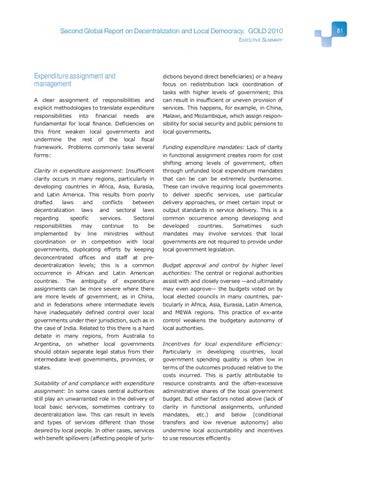 Expenditure assignment and management A clear assignment of responsibilities and explicit methodologies to translate expenditure responsibilities into financial needs are fundamental for local finance. Deficiencies on this front weaken local governments and undermine the rest of the local fiscal framework. Problems commonly take several forms: Clarity in expenditure assignment: Insufficient clarity occurs in many regions, particularly in developing countries in Africa, Asia, Eurasia, and Latin America. This results from poorly drafted laws and conflicts between decentralization laws and sectoral laws regarding specific services. Sectoral responsibilities may continue to be implemented by line ministries without coordination or in competition with local governments, duplicating efforts by keeping deconcentrated offices and staff at predecentralization levels; this is a common occurrence in African and Latin American countries. The ambiguity of expenditure assignments can be more severe where there are more levels of government, as in China, and in federations where intermediate levels have inadequately defined control over local governments under their jurisdiction, such as in the case of India. Related to this there is a hard debate in many regions, from Australia to Argentina, on whether local governments should obtain separate legal status from their intermediate level governments, provinces, or states. Suitability of and compliance with expenditure assignment: In some cases central authorities still play an unwarranted role in the delivery of local basic services, sometimes contrary to decentralization law. This can result in levels and types of services different than those desired by local people. In other cases, services with benefit spillovers (affecting people of juris-