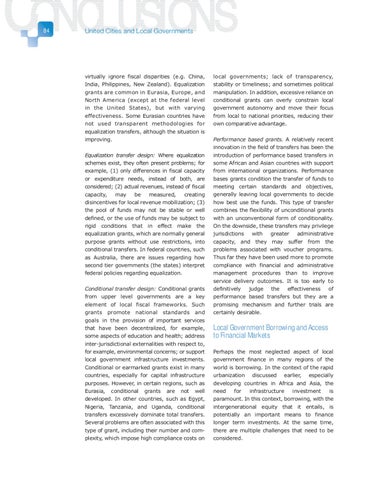 local governments; lack of transparency, stability or timeliness; and sometimes political manipulation. In addition, excessive reliance on conditional grants can overly constrain local government autonomy and move their focus from local to national priorities, reducing their own comparative advantage. Performance based grants. A relatively recent innovation in the field of transfers has been the introduction of performance based transfers in some African and Asian countries with support from international organizations. Performance bases grants condition the transfer of funds to meeting certain standards and objectives, generally leaving local governments to decide how best use the funds. This type of transfer combines the flexibility of unconditional grants with an unconventional form of conditionality. On the downside, these transfers may privilege jurisdictions with greater administrative capacity, and they may suffer from the problems associated with voucher programs. Thus far they have been used more to promote compliance with financial and administrative management procedures than to improve service delivery outcomes. It is too early to definitively judge the effectiveness of performance based transfers but they are a promising mechanism and further trials are certainly desirable.