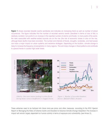 Figure 1 shows recorded disaster events worldwide and indicates an increasing trend as well as number of actual occurrences. The figure indicates that the number of recorded seismic events (deadliest in terms of loss of life) is relatively constant, but points to an increase in the reported number of storms and floods. In many parts of the world, the risks associated with weather-related hazards are on the rise (the risk of economic losses is also on the rise, although fewer deaths have been recorded). The number and intensity of floods, droughts, landslides, and heat waves can have a major impact on urban systems and resilience strategies. Depending on the location, climate change is likely to increase the frequency of precipitation in many regions. This will imply changes in flood patterns and contribute to upward trends in coastal high water levels.