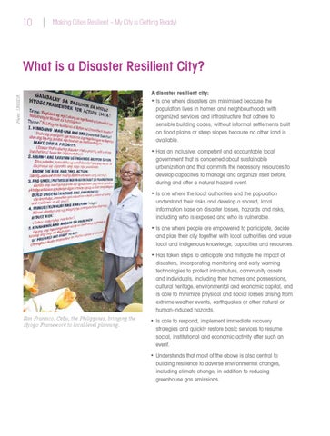 A disaster resilient city: • Is one where disasters are minimised because the population lives in homes and neighbourhoods with organized services and infrastructure that adhere to sensible building codes; without informal settlements built on flood plains or steep slopes because no other land is available. • Has an inclusive, competent and accountable local government that is concerned about sustainable urbanization and that commits the necessary resources to develop capacities to manage and organize itself before, during and after a natural hazard event. • Is one where the local authorities and the population understand their risks and develop a shared, local information base on disaster losses, hazards and risks, including who is exposed and who is vulnerable. • Is one where people are empowered to participate, decide and plan their city together with local authorities and value local and indigenous knowledge, capacities and resources. • Has taken steps to anticipate and mitigate the impact of disasters, incorporating monitoring and early warning technologies to protect infrastruture, community assets and individuals, including their homes and possessions, cultural heritage, environmental and economic capital, and is able to minimize physical and social losses arising from extreme weather events, earthquakes or other natural or human-induced hazards. San Fransico, Cebu, the Philippines, bringing the Hyogo Framework to local level planning.