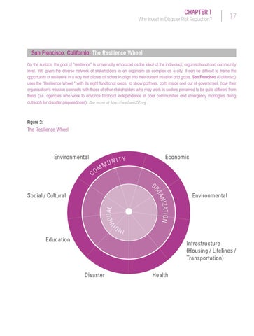 San Francisco, California: The Resilience Wheel On the surface, the goal of “resilience” is universally embraced as the ideal at the individual, organisational and community level. Yet, given the diverse network of stakeholders in an organism as complex as a city, it can be difficult to frame the opportunity of resilience in a way that allows all actors to align it to their current mission and goals. San Francisco (California) uses the “Resilience Wheel,” with its eight functional areas, to show partners, both inside and out of government, how their organisation’s mission connects with those of other stakeholders who may work in sectors perceived to be quite different from theirs (i.e. agencies who work to advance financial independence in poor communities and emergency managers doing outreach for disaster preparedness). See more at http://resilientSF.org .