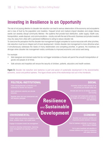 Investing in Resilience is an Opportunity The risk of not paying attention to disaster risk reduction can lead to serious deterioration of the economy and ecosystems and a loss of trust by the population and investors. Frequent small and medium-impact disasters and single intense events can severely disrupt community lifelines—the systems that provide food distribution, water supply, health care, transportation, waste disposal, and communications—locally and with the rest of the world. Business and private investors may shy away from cities with a perceived indifference to acting to reduce disaster risk. To overcome the perception that the disaster risk management budget competes for scarce resources with other priorities, risk reduction must be an integral part of local development. Holistic disaster risk management is more attractive when it simultaneously addresses the needs of many stakeholders and competing priorities. In general, the incentives are stronger when disaster risk management visibly contributes to improved economic and social well-being. For example: • Well-designed and drained roads that do not trigger landslides or floods will permit the smooth transportation of goods and people at all times. •