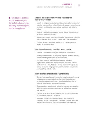 Establish a legislative framework for resilience and disaster risk reduction • Identify the obligations, constraints and opportunities that current urban planning and regulations, national laws and regulatory devices impose on the city administration; improve local regulations with resilience criteria. • Generate municipal ordinances that support disaster risk reduction in all sectors (public and private). • Update environmental, building and planning standards and bylaws to support risk reduction and anchor them in recent risk assessments. • Ensure a degree of flexibility in regulations for low-income areas, without compromising safety.