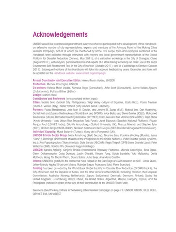 Acknowledgements UNISDR would like to acknowledge and thank everyone who has participated in the development of this Handbook: an extensive number of city representatives, experts and members of the Advisory Panel of the Making Cities Resilient Campaign, not all of whom are mentioned by name. The scope, form and examples contained in the Handbook were collected through interviews with mayors and local government representatives at the Global Platform for Disaster Reduction (Geneva, May 2011); at a validation workshop in the City of Chengdu, China (August 2011); with mayors, parliamentarians and experts at a stock taking workshop on cities’ use of the Local Government Self-Assessment Tool in the City of Incheon (October 2011); and at a workshop in Geneva (October 2011). Subsequent editions of this Handbook will take into account feedback by users. Examples and tools will be updated on the Handbook website: www.unisdr.org/campaign. Project Coordinator and Executive Editor: Helena Molin Valdés, UNISDR Production: Michele Cocchiglia, UNISDR Co-authors: Helena Molin Valdés, Aloysius Rego (Consultant), John Scott (Consultant), Jaime Valdés Aguayo (Collaborator), Patricia Bittner (Editor) Design: Ramon Valle Contributors and Reviewers (who provided written input): Cities: Violeta Seva (Makati City, Phillippines), Yelgi Verley (Mayor of Siquirres, Costa Rica), Paola Trevisan (CORILA, Venice, Italy), Nada Yamout (City Council Beirut, Lebanon). Partners: Fouad Bendimerad, Jose Mari O. Daclan, and Jerome B. Zayas (EMI); Marcus Lee, Dan Hoornweg, Daniel Kull and Zuzana Svetlosakova (World Bank and GFDRR); Alice Balbo and Steve Gawler (ICLEI); Mohamed Boussraoui (UCLG); Bernadia Irawati Tjandradewi (CITYNET); Dan Lewis and Ana Moreno (UNHABITAT); Rajib Shaw (Kyoto University - Asia Urban Risk Reduction Task Force); Janet Edwards (Swedish National Platform); Piyush Ranjan Rout (LG-NET, India); Dilanthi Amaratunga (Salford University, UK), Marcus Moench and Stephen Tyler (ISET); Hachim Badji (CADRI-UNDP); Shailesh Kataria and Boris Zerjav (RICS Disaster Management Commission). Individual Capacity: Murat Balamir (Turkey), Garry de la Pommerai (UK). UNISDR Private Sector Group: Mark Armstrong (Field Secure); Nicerine Bres, Caroline Woolley (Marsh); Jesus “Gary” S.Domingo (Permanent Mission of the Philippines to the United Nations); Peter Gruetter (Cisco Systems, Inc.); Aris Papadopoulos (Titan America); Dale Sands (AECOM); Régis Thepot (EPTB Seine Grands Lacs); Peter Williams (IBM); Sandra Wu (Kokusai Kogyo Holdings). UNISDR: Sandra Amlang, Sanjaya Bhatia (International Recovery Platform), Michele Cocchiglia, Bina Desai, Glenn Dolcemascolo, Craig Duncan, Justin Ginnetti, Vincent Fung, Sarah Landelle, Yuki Matsuoka, Denis McClean, Hang Thi Thanh Pham, Dizery Salim, Julio Serje, Ana Maria Castillo. Interns: UNISDR is grateful to the interns that have helped on the Campaign and with research in 2011: Javier Quero, Jeffrey Makala Ngaka, Shashank Mishra, Rajinder Sagoo, Francesca Salvi, Pierre Branciard. Funding has been provided by the World Bank Global Facility for Disaster Risk Reduction (GFDRR-Track I), the City of Incheon and the Republic of Korea, and the other donors to the UNISDR, including: Sweden; the European Commission; Australia; Norway; Netherlands; Japan; Switzerland; Denmark; Germany; Finland; Spain; the United Kingdom; Luxembourg; Brazil; China; the United States; Argentina; Mexico; Hungary; Cyprus; and the Philippines (ranked in order of the size of their contribution to the UNISDR Trust Fund). See more about the key partners in the Making Cities Resilient campaign on page 71: UNISDR, GFDRR, ICLEI, UCLG, CITYNET, EMI, UNHABITAT.