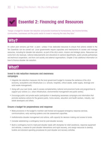 Why? An action plan remains just that—a plan—unless it has dedicated resources to ensure that actions related to the Ten Essentials can be carried out. Local governments require capacities and mechanisms to access and manage resources, including for disaster risk reduction, as part of the city’s vision, mission and strategic plans. Resources can come from city revenues, national disbursements and allocations to sectoral departments, public-private partnerships and technical cooperation, and from civil society and external organisations. Chapter 3 has additional information on how to finance disaster risk reduction.