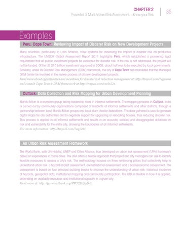 Examples Peru, Cape Town: Reviewing Impact of Disaster Risk on New Development Projects Many countries, particularly in Latin America, have systems for assessing the impact of disaster risk on productive infrastructure. The UNISDR Global Assessment Report 2011 highlights Peru, which established a pioneering legal requirement that all public investment projects be evaluated for disaster risk. If the risk is not addressed, the project will not be funded. Of the US $10 billion investment approved in 2008, about half was to be executed by local governments. Similarly, under its Disaster Risk Management (DRM) framework, the city of Cape Town has mandated that the Municipal DRM Center be involved in the review process of all new development projects. Read more about opportunities and incentives for disaster risk reduction management at: http://tinyurl.com/7sganme and consult Cape Town’s DRM framework at http://tinyurl.com/cw9n22x.