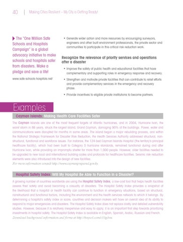 Examples Cayman Islands: Making Health Care Facilities Safer The Cayman Islands are one of the most frequent targets of Atlantic hurricanes, and in 2004, Hurricane Ivan, the worst storm in 86 years, struck the largest island, Grand Cayman, damaging 90% of the buildings. Power, water and communications were disrupted for months in some areas. The island began a major rebuilding process, and within the National Strategic Framework for Disaster Risk Reduction, the Health Services Authority addressed structural, nonstructural, functional and workforce issues. For instance, the 124-bed Cayman Islands Hospital (the territory’s principal healthcare facility), which had been built to Category 5 hurricane standards, remained functional during and after Hurricane Ivan, while providing an impromptu shelter for more than 1,000 people. However, older facilities needed to be upgraded to new local and international building codes and protocols for healthcare facilities. Seismic risk reduction elements were also introduced into the design of new facilities. For more information consult http://www.caymanprepared.gov.ky.