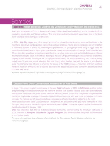 Examples Saijo City: Watch and Learn: Children and Communities Study Mountain and Urban Risks As early as kindergarten, schools in Japan are educating children about how to detect and react in disaster situations, conducting regular drills and “disaster watches.” This long-time investment undoubtedly saved many lives in the March 2011 Great East Japan earthquake and tsunami. In 2004, Saijo City, Japan was hit by record typhoons that caused flooding in urban areas and landslides in the mountains. Saijo City’s aging population represents a particular challenge. Young able-bodied people are very important to community systems of mutual aid and emergency preparedness. As young people move away to bigger cities, the population of smaller towns in Japan grows older than the already imbalanced national average. Small cities like Saijo City are also often spread over a mix of geographic terrains – an urban plain, semi-rural and isolated villages on hills and mountains or along the coast. To meet these challenges, the Saijo City government began a risk-awareness programme, targeting school children. Focusing on the city’s physical environment, the “mountain-watching” and “town-watching” project takes 12-year-olds on risk education field trips. Young urban dwellers meet with the elderly to learn together about the risks facing Saijo City and to remember the lessons of the 2004 typhoons. A “mountain- and town-watching” handbook has been developed, and a teachers’ association for disaster education and a children’s disaster prevention club have been set up. For more information consult http://www.unisdr.org/we/inform/publications/13627 (page 29).