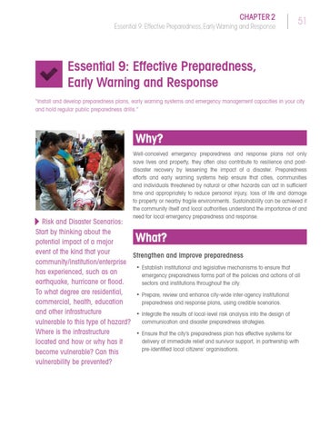 Essential 9: Effective Preparedness, Early Warning and Response “Install and develop preparedness plans, early warning systems and emergency management capacities in your city and hold regular public preparedness drills.”
