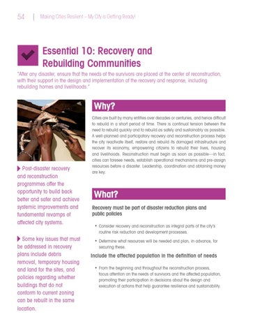 Cities are built by many entities over decades or centuries, and hence difficult to rebuild in a short period of time. There is continual tension between the need to rebuild quickly and to rebuild as safely and sustainably as possible. A well-planned and participatory recovery and reconstruction process helps the city reactivate itself, restore and rebuild its damaged infrastructure and recover its economy, empowering citizens to rebuild their lives, housing and livelihoods. Reconstruction must begin as soon as possible—in fact, cities can foresee needs, establish operational mechanisms and pre-assign resources before a disaster. Leadership, coordination and obtaining money are key.