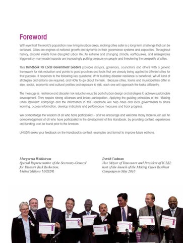 Foreword With over half the world’s population now living in urban areas, making cities safer is a long-term challenge that can be achieved. Cities are engines of national growth and dynamic in their governance systems and capacities. Throughout history, disaster events have disrupted urban life. An extreme and changing climate, earthquakes, and emergencies triggered by man-made hazards are increasingly putting pressure on people and threatening the prosperity of cities. This Handbook for Local Government Leaders provides mayors, governors, councillors and others with a generic framework for risk reduction and points to good practices and tools that are already being applied in different cities for that purpose. It responds to the following key questions: WHY building disaster resilience is beneficial; WHAT kind of strategies and actions are required; and HOW to go about the task. Because cities, towns and municipalities differ in size, social, economic and cultural profiles and exposure to risk, each one will approach the tasks differently. The message is: resilience and disaster risk reduction must be part of urban design and strategies to achieve sustainable development. They require strong alliances and broad participation. Applying the guiding principles of the “Making Cities Resilient” Campaign and the information in this Handbook will help cities and local governments to share learning, access information, develop indicators and performance measures and track progress. We acknowledge the wisdom of all who have participated – and we encourage and welcome many more to join us! An acknowledgement of all who have participated in the development of this Handbook, by providing content, experiences and funding, can be found prior to the Annexes. UNISDR seeks your feedback on the Handbook’s content, examples and format to improve future editions.