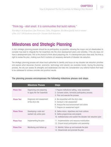 Milestones and Strategic Planning A city’s strategic planning process should be as participatory as possible, allowing the mayor and all stakeholders to consider how best to integrate the Ten Essentials into the city’s development plans and activities. If the city does not have a development plan, this is the chance to think about preparing one. If a development plan does exist, the time is right to review the plan, making sure that it contains all necessary elements of disaster risk reduction. The strategic planning process will allow local authorities to identify and focus on key disaster risk reduction priorities and explore what resources (human, economic, technology and natural) are available locally. During the planning process, the city can assess its strengths and weaknesses and take into consideration any external factors that need to be addressed to achieve concrete and practical results.