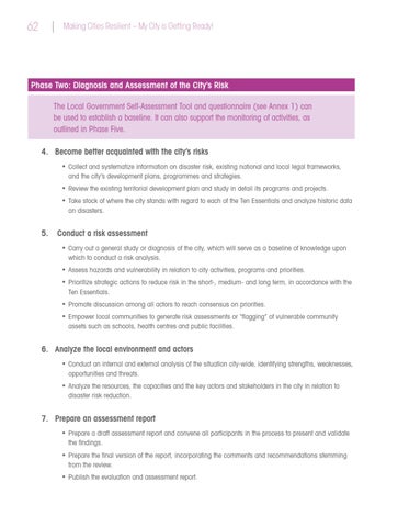 Phase Two: Diagnosis and Assessment of the City’s Risk The Local Government Self-Assessment Tool and questionnaire (see Annex 1) can be used to establish a baseline. It can also support the monitoring of activities, as outlined in Phase Five. 4. Become better acquainted with the city’s risks • Collect and systematize information on disaster risk, existing national and local legal frameworks, and the city’s development plans, programmes and strategies. • Review the existing territorial development plan and study in detail its programs and projects. • Take stock of where the city stands with regard to each of the Ten Essentials and analyze historic data on disasters.