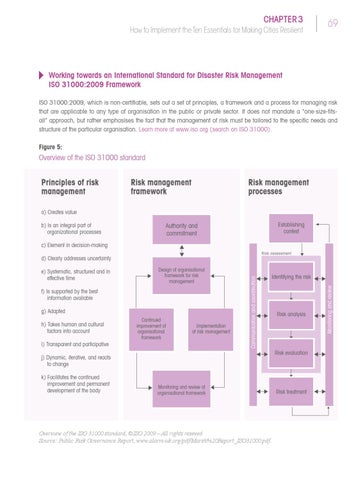 Working towards an International Standard for Disaster Risk Management ISO 31000:2009 Framework ISO 31000:2009, which is non-certifiable, sets out a set of principles, a framework and a process for managing risk that are applicable to any type of organisation in the public or private sector. It does not mandate a “one-size-fitsall” approach, but rather emphasises the fact that the management of risk must be tailored to the specific needs and structure of the particular organisation. Learn more at www.iso.org (search on ISO 31000). Figure 5: