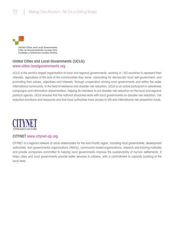 United Cities and Local Governments (UCLG) www.cities-localgovernments.org UCLG is the world’s largest organisation of local and regional governments, working in 140 countries to represent their interests, regardless of the size of the communities they serve, advocating for democratic local self-government, and promoting their values, objectives and interests, through cooperation among local governments and within the wider international community. In the field of resilience and disaster risk reduction, UCLG is an active participant in awareness campaigns and information dissemination, helping its members to put disaster risk reduction on the local and regional political agenda. UCLG ensures that the national structures work with local governments on disaster risk reduction, risk reduction functions and resources and that local authorities have access to UN and international risk prevention funds.