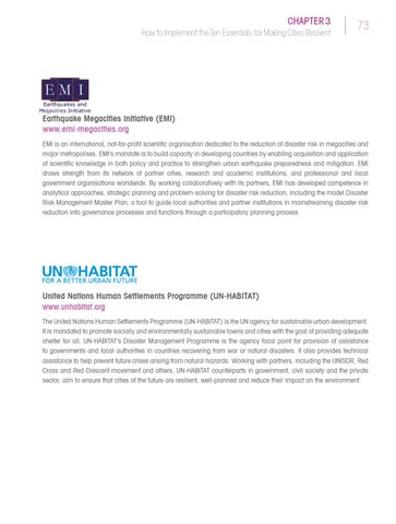 United Nations Human Settlements Programme (UN-HABITAT) www.unhabitat.org The United Nations Human Settlements Programme (UN-HABITAT) is the UN agency for sustainable urban development. It is mandated to promote socially and environmentally sustainable towns and cities with the goal of providing adequate shelter for all. UN-HABITAT’s Disaster Management Programme is the agency focal point for provision of assistance to governments and local authorities in countries recovering from war or natural disasters. It also provides technical assistance to help prevent future crises arising from natural hazards. Working with partners, including the UNISDR, Red Cross and Red Crescent movement and others, UN-HABITAT counterparts in government, civil society and the private sector, aim to ensure that cities of the future are resilient, well-planned and reduce their impact on the environment.