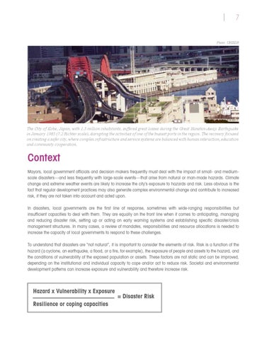 Context Mayors, local government officials and decision makers frequently must deal with the impact of small- and mediumscale disasters—and less frequently with large-scale events—that arise from natural or man-made hazards. Climate change and extreme weather events are likely to increase the city’s exposure to hazards and risk. Less obvious is the fact that regular development practices may also generate complex environmental change and contribute to increased risk, if they are not taken into account and acted upon. In disasters, local governments are the first line of response, sometimes with wide-ranging responsibilities but insufficient capacities to deal with them. They are equally on the front line when it comes to anticipating, managing and reducing disaster risk, setting up or acting on early warning systems and establishing specific disaster/crisis management structures. In many cases, a review of mandates, responsibilities and resource allocations is needed to increase the capacity of local governments to respond to these challenges. To understand that disasters are “not natural”, it is important to consider the elements of risk. Risk is a function of the hazard (a cyclone, an earthquake, a flood, or a fire, for example), the exposure of people and assets to the hazard, and the conditions of vulnerability of the exposed population or assets. These factors are not static and can be improved, depending on the institutional and individual capacity to cope and/or act to reduce risk. Societal and environmental development patterns can increase exposure and vulnerability and therefore increase risk.
