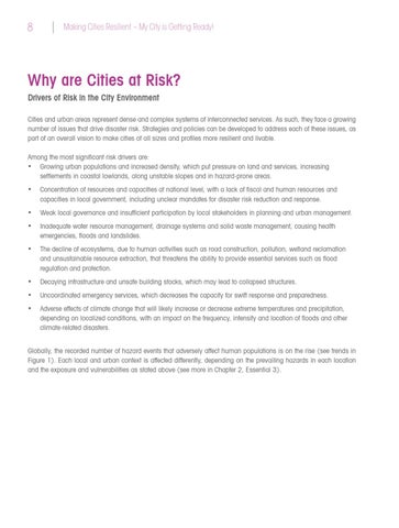 Why are Cities at Risk? Drivers of Risk in the City Environment Cities and urban areas represent dense and complex systems of interconnected services. As such, they face a growing number of issues that drive disaster risk. Strategies and policies can be developed to address each of these issues, as part of an overall vision to make cities of all sizes and profiles more resilient and livable. Among the most significant risk drivers are: • Growing urban populations and increased density, which put pressure on land and services, increasing settlements in coastal lowlands, along unstable slopes and in hazard-prone areas. •